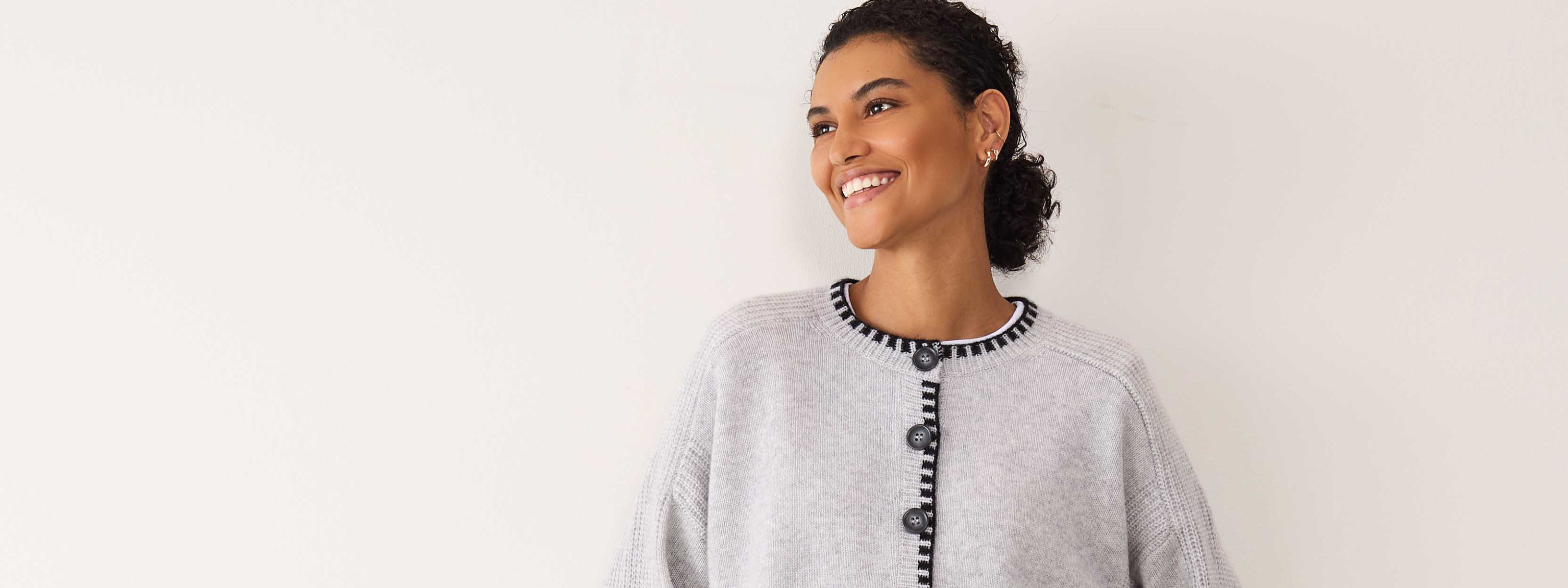 If your cashmere cardigan gets wet, gently blot the excess water with a towel without wringing or twisting the fabric. Lay it flat on a clean, dry towel, reshaping it if necessary, and let it air dry away from direct heat or sunlight. Read more about how to care for your cashmere in our care guide.